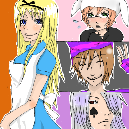 左はアリス、右は上から 白ウサギ(臆病) チェシャ猫(飄々) トランプ兵(冷酷) ですー(人′3`)