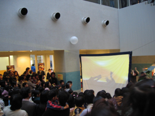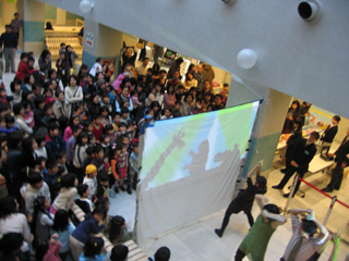幕間に、ロビーで影絵のパフォーマンスがあるというので、さっそく見に行きました。 |
