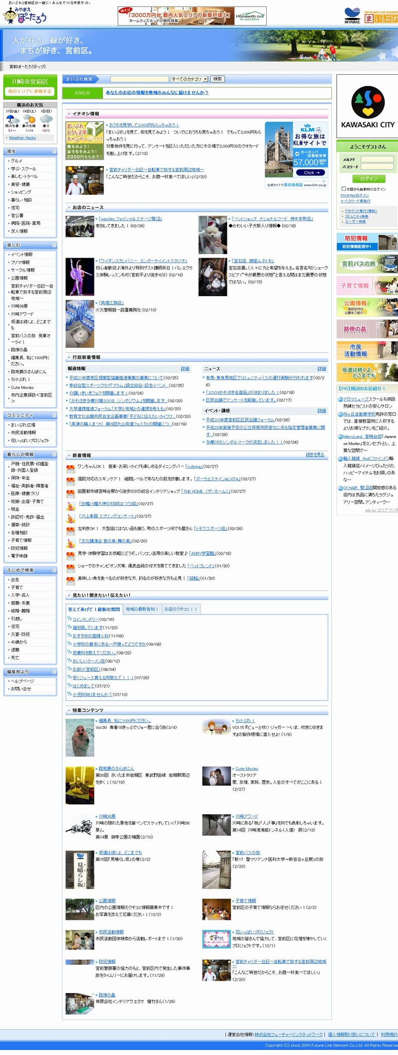 株式会社フューチャーリンクネットワーク(以下、F社)は、『ちょっとがんばれば自転車でまわれちゃう、そんな小さなまちの情報をお届けします』をキャッチフレーズに地域情報サイト「まいぷれ」を2000年4月より首都圏、九州、山陰、近畿、北関東、東北などでエリア展開している。 「宮前ぽーたろう」は、「まいぷれ」のひとつとして2006年8月にオープンした川崎市宮前区のポータルサイト。川崎市、宮前区とF社が一体となって企画・運営し、行政情報も民間の情報も関係なく、宮前区のことなら何でも載ってるサイトを目指す。 F社への委託補助金支払いは3年間で、以後は「宮前ぽーたろう」の自立採算となる。継続のための収益源は地域の店の広告掲載料であるが、あらゆる業種の小規模の店にも加入していただけるように月1000円からと極めて低額に設定している。 昨年12月からは、地元商店を利用してたまるポイントで地域に花壇を寄贈していく取り組み「花いっぱいプロジェクト」を開始した。 (kay1938) |