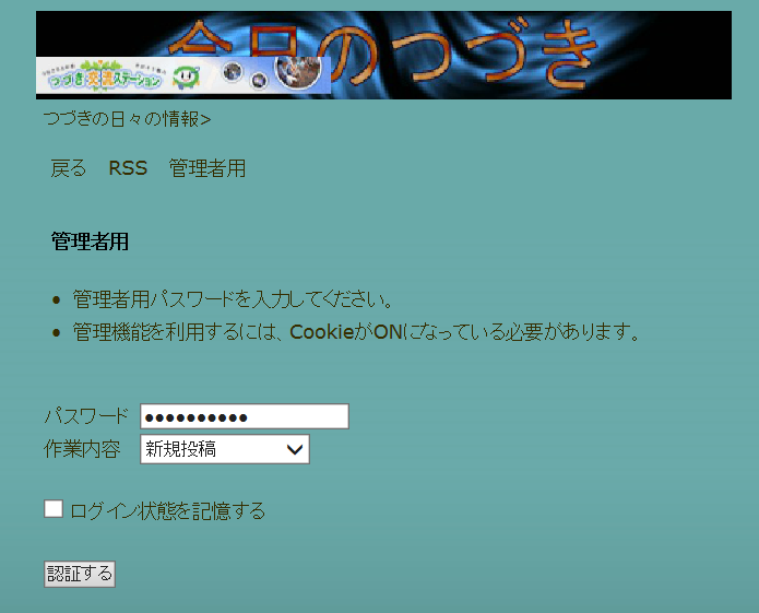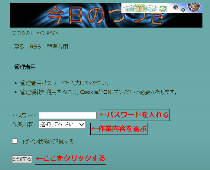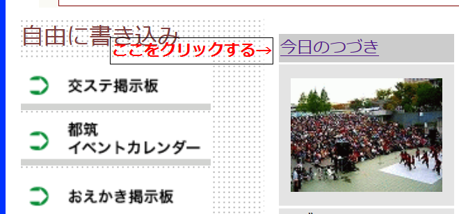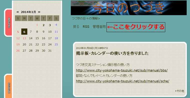 今日のつづき http://www.city-yokohama-tsuzuki.net/sub/tsuzuki01/diary.cgi 都筑おいしいものブログ http://www.city-yokohama-tsuzuki.net/sub/food01/diary.cgi 都筑区の開店閉店 http://www.city-yokohama-tsuzuki.net/kaiten/diary.cgi 花ブログ http://www.city-yokohama-tsuzuki.net/sub/hanablog01/diary.cgi 上記のページは全て同じ方法で使えます。ここでは「今日のつづき」で説明します。 |
