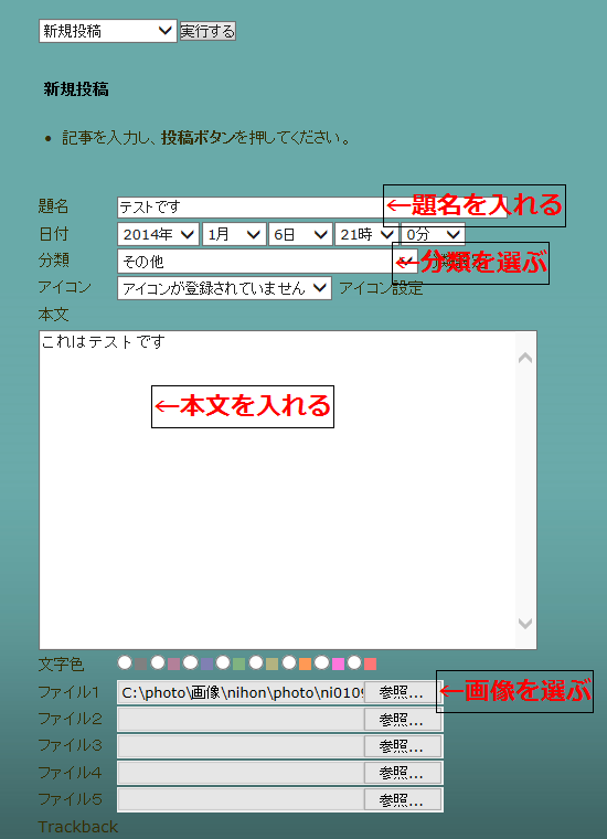 題名を入れる。分類を選ぶ、本文を入れる(貼り付けでも可)、必要に応じて画像、写真を選ぶ |
