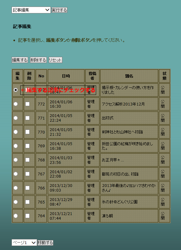下図のような画面が現れるので、「編集」または「削除」にチェックをします。そして「編集する」又は「削除する」をクリックします。 |