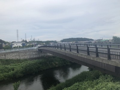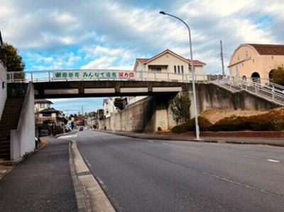 | 橋上から川和台方面を望む。欄干の南側には何故か暴力団追放の横断幕が貼られている |
