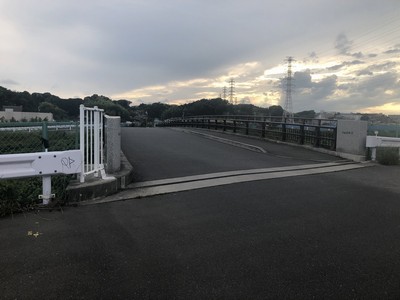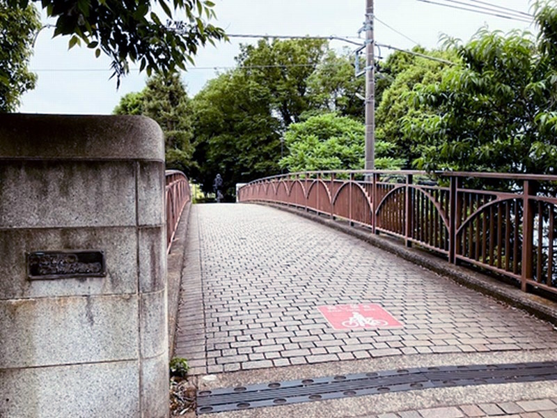 | 加賀原1丁目側から撮す。正面の樹木は月出松公園の植込み。植込みの向こう側はグラウンド。橋の上には、なぜか「自転車は押し歩き」のマークが書かれているが押し歩きしている人は見たことがない。 |