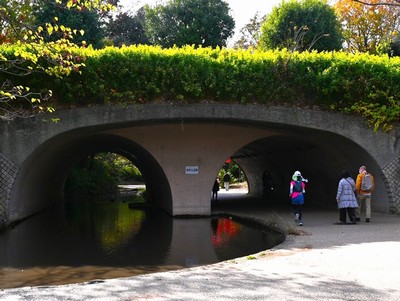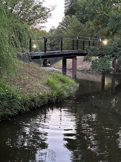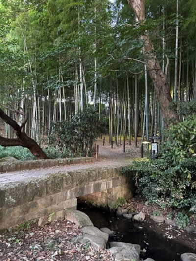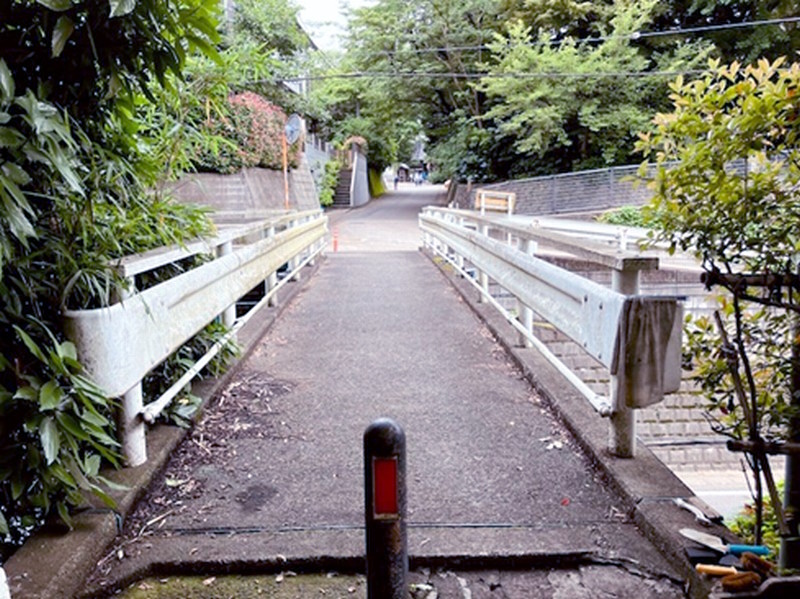 緑道「ささぶねのみち」を仲町台方面に歩いていくと、茅ケ崎公園にたどり着く。この公園には、池から流れ出る小川にかかる小さな石橋が存在する。