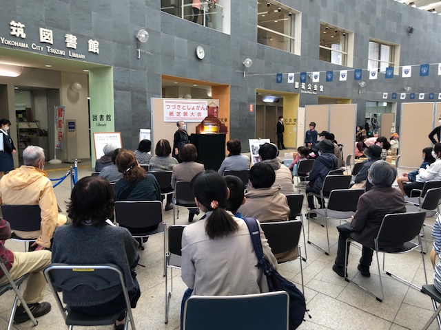 都筑区総合庁舎1階の区民ホールで紙芝居の展示を3日間行い、最終日には「つづきとしょかん紙芝居大会」で横浜市北部4区で活躍する紙芝居グループの実演がありました。ときわひろみさんの講演会が6階の大会議室で開催されました。