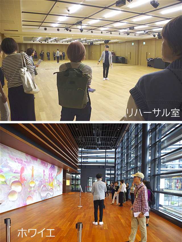 各施設についてスタッフの方に案内され、ホールでは音響効果、 緞帳デザイン の謂れや舞台上にも案内され観客の見え方、照明効果など多目的な演目に対応した詳細な説明があった。