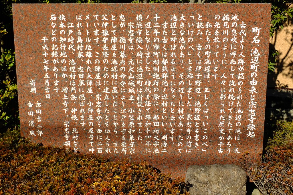 由来 町名、池辺町の由来と宗忠寺縁起(碑) 古代より人跡が認められた池辺の地は、天地の息吹に呼応して流れ続けてきたであろう鶴見川のように、人々に彩られた歴史が千古の光を放っています。 私たちの町池辺は、正しくは「いこのべ」と読み、古くは伊子野辺、池野辺とも書き、「いけのべ」とも称しました。宗忠寺の前に大きな池があり、その辺りに村があったので池辺と呼ばれるようになったと云います