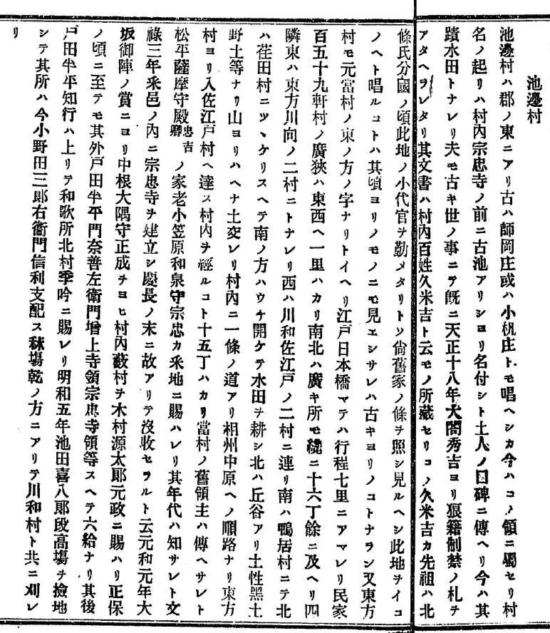 ・「新編武蔵風土記稿都筑郡池辺村」1800年頃(国立国会図書館デジタルコレクションより) 村内宗忠寺の前に古池ありしより名付しと土人の口碑に伝へり今は其蹟水田となれり ・今昔マップ 1896年〜1909年、1965年〜1968年、1975年〜1978年、1998年〜2005年、地理院地図を比べてみる 1965年までは水田、1975年日本電気、松下通信工業、大日本印刷、緑産業道路、第三京浜(1966年頃)などが出てきます。 緑産業道路が出来て工業団地、工場が建設され始めるのが1966年。ちなみに日本電気が3階建て、2005年12月NEC横浜事業場閉鎖、2007年4月ららぽーと横浜(3階建て)オープン。