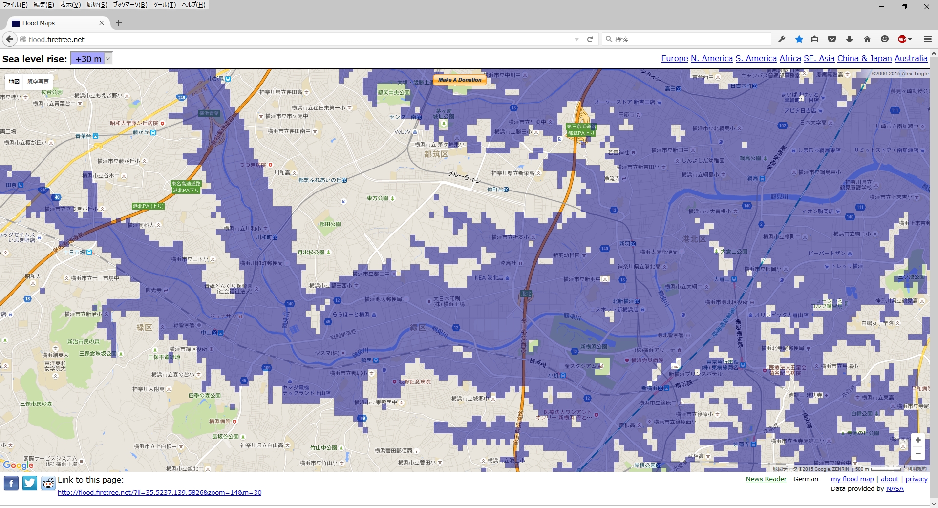Flood Mapsはなかなか便利なツールです。毎年各地で水害がありますが、この地図で水位を調整してみるとやっぱり低地のところが大半です。 2015年11月2日(月)