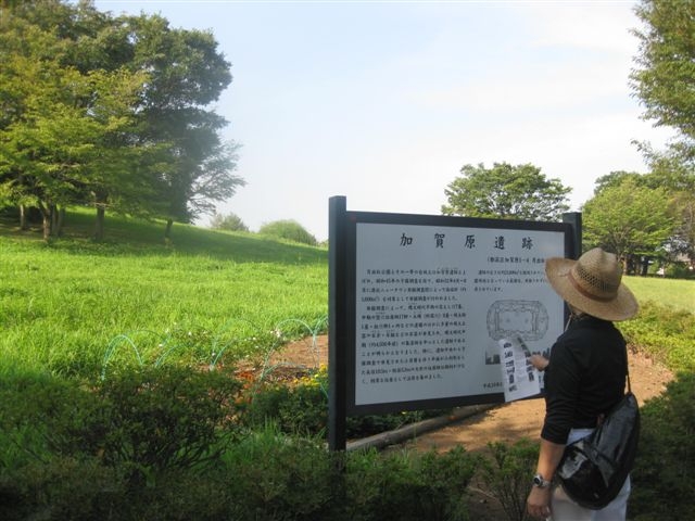 ところで、月出松公園の位置は、字名では「大原」と「加賀原」に重なっており、そこには縄文時代の遺跡があります。「加賀原遺跡」です。教育委員会は公園内看板を設置してくれました。 遺跡の大半は、公園内のそのまま保存されています。ただし看板には「かがはら遺跡」とフリガナがありますが、横浜市埋蔵文化センターの公式記録には「かがっぱら遺跡」とフリガナがあります。多分、看板の方が間違えでしょう。 (港北ニュータウン地域内埋蔵文化財調査報告?]「全遺跡調査概要」1990年)