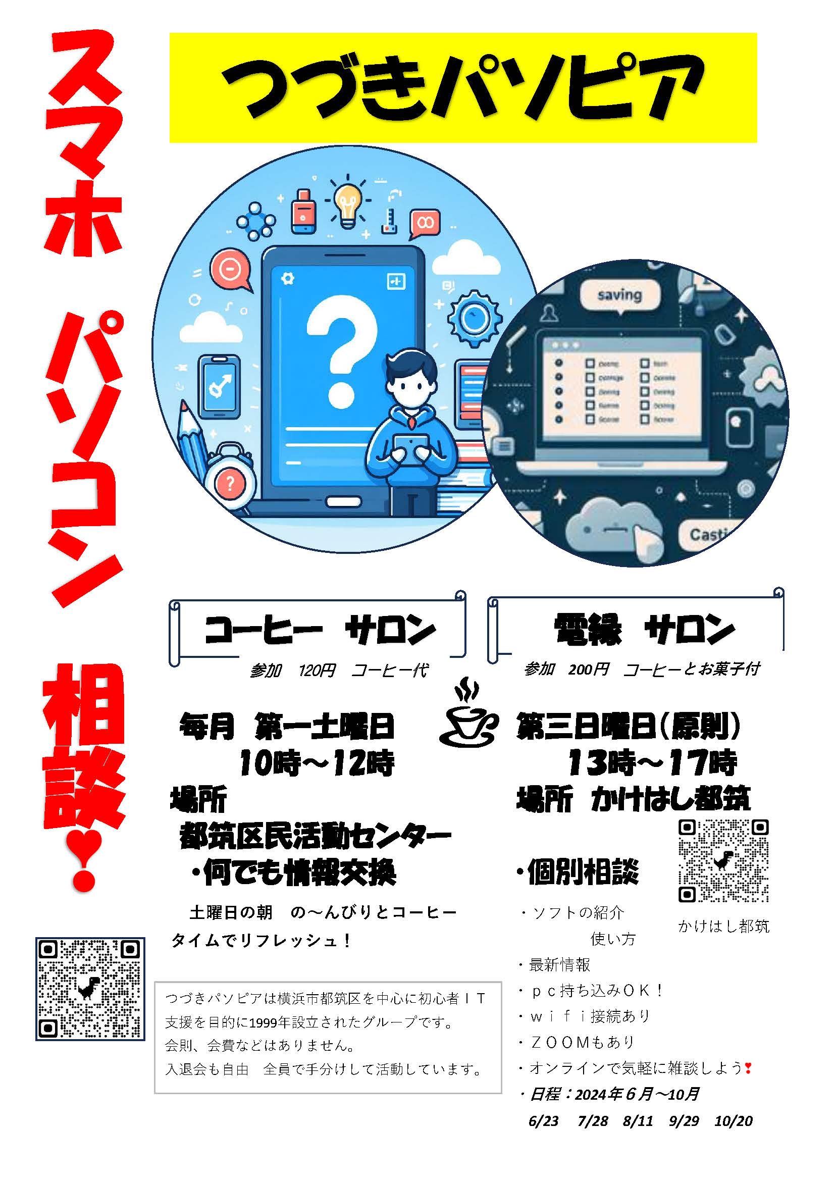 内容 ・Zoomの使い方、実習 ・スマホ・タブレットの相談 ・パソコンの相談 ・Chatgptの生成AIの使い方 ・画像生成AIの使い方 ・ファイル管理について ・最近のフリーソフトウェアの話題 ・日頃お困りの相談ごと、個別に対応します。 ・最新情報(インターネット・ソフトウェア)など ・その他、いろいろ ・雑談会