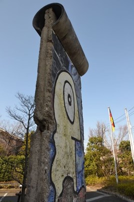 由来:1961年に155㎞にわたって作られたベルリンの壁は、1989年に崩壊した。本社がドイツにあるテユフは、テクノロジーセンターの開所にあたり、日独親善と永遠の平和と自由を祈念してベルリンの壁を設置した。イラスト側は西ドイツ、裏側(コンクリート打ち抜き)は東ドイツ。