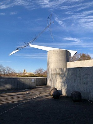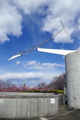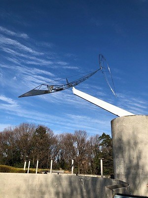 由来:プールのすぐ横を見上げると、金属の大きなモニュメントがある。このモニュメントは、彫刻家の西野康造さんの第6回AACA賞特別賞を受賞した作品である。チタンやステンレスを素材に繊細かつダイナミックな造形表現で独自の自然風景を創造してきた。量感を抑えた構造で時空の広がり、空や宇宙への憧憬や畏怖を原点としている。