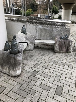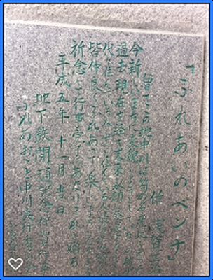 由来:中川の名産「筍」を象った彫刻らしいオブジェと一体化した石造りのベンチが設置されている。これは浅賀正治氏による創作である。