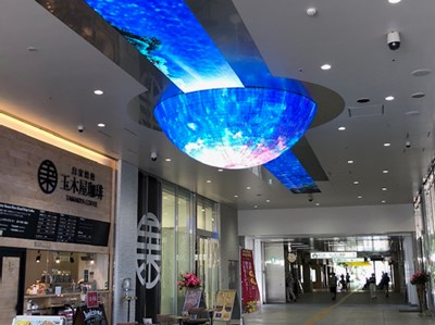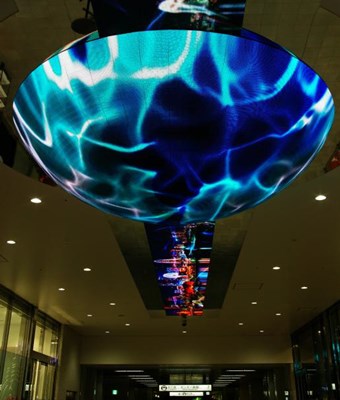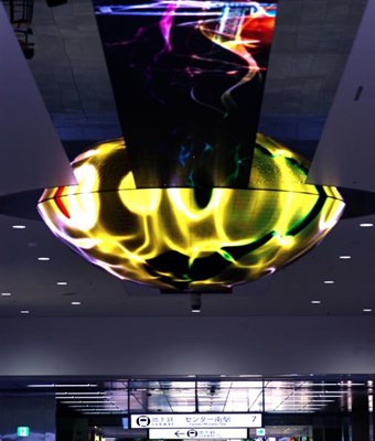 由来:市営地下鉄センター南駅は、ブルーライン(開通1993年)とグリーンライン(2008年開通)の両方の路線があり、都筑区役所、都筑警察署とも近く、センター北駅と共に、都筑区のタウンセンターとなっている。このセンター南駅のビルに直結して東側に光ビルがあり、 スーパー、食堂、銀行、パチンコ店など賑やかだ。1階のバスターミナル・タクシー乗り場「出口7」を通ると、バスロータリから地下鉄改札口(3階)に向かう通路に、誰もがナニコレと驚く光のオブジェに遭遇する。光の模様が動いており、見ていて飽きることがない。