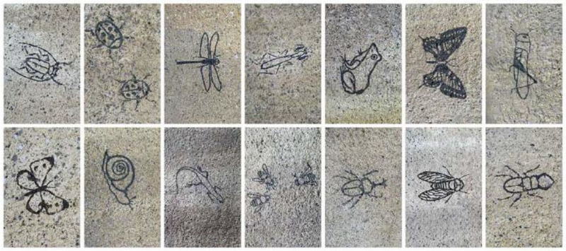施工業者である岡三リビック(株)提供の、富士塚が再構築された当時の昆虫や生物の原画を、ここに掲載して、描かれた線画を後世の子ども達へ残すよすがとなれば幸いである。