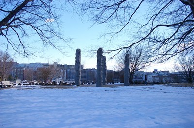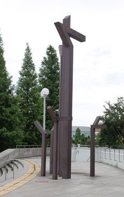 設計事務所の提案で総合庁舎モニュメントを設置することになり、建築局建築部長を座長に選定委員会を設置し、メインの出入口の前面広場に、都筑区の発展をイメージするものとして設置した。