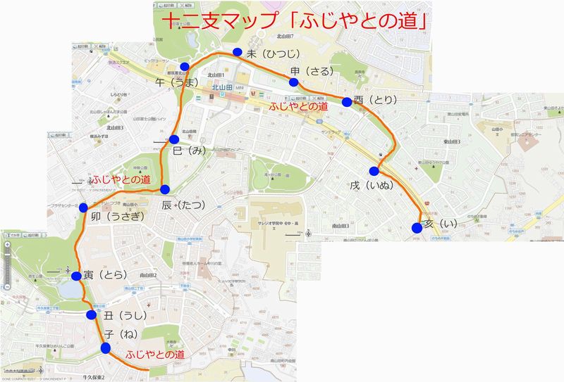 最初の「子」の石は牛久保東の「なつみかん公園」の側、最後の「亥」は 南山田3丁目の花壇の中にある。「戌」だけは石ではなく、鉄製の犬。城山歩道橋の親柱に設置された。