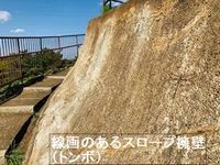 由来:「いろを塗るだけではつまらない。子ども達が喜びそうな昆虫や生物を」との、横浜市担当者からの要望により、施工業者が斜面いろどり工法で周囲の環境になじんだ壁面を構築、絵画担当者により里山を彷彿させる昆虫や蛙など十数体の線画が描かれた。