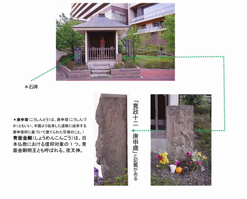 庚申塔は、もと正覚寺の裏手にあったものを現在の地に移転したと記されている。