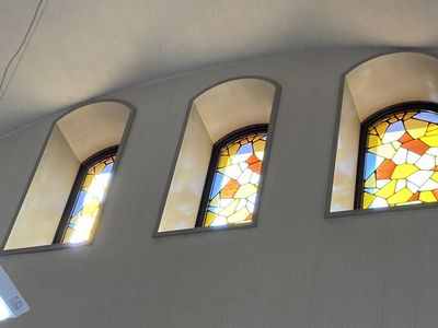 圧迫感のない曲線のカウンター、吹き抜けの天井、ステンドグラスの高窓など南欧のイメージを取り入れた中川地区の中心的な建物である。 |
