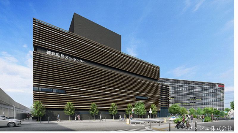 ボッシュ本社(右奥)・都筑区民文化センター(仮称)(左)センター北駅側から見た施設完成イメージ