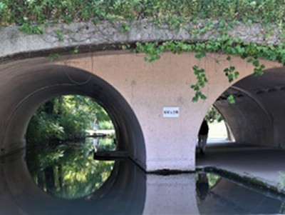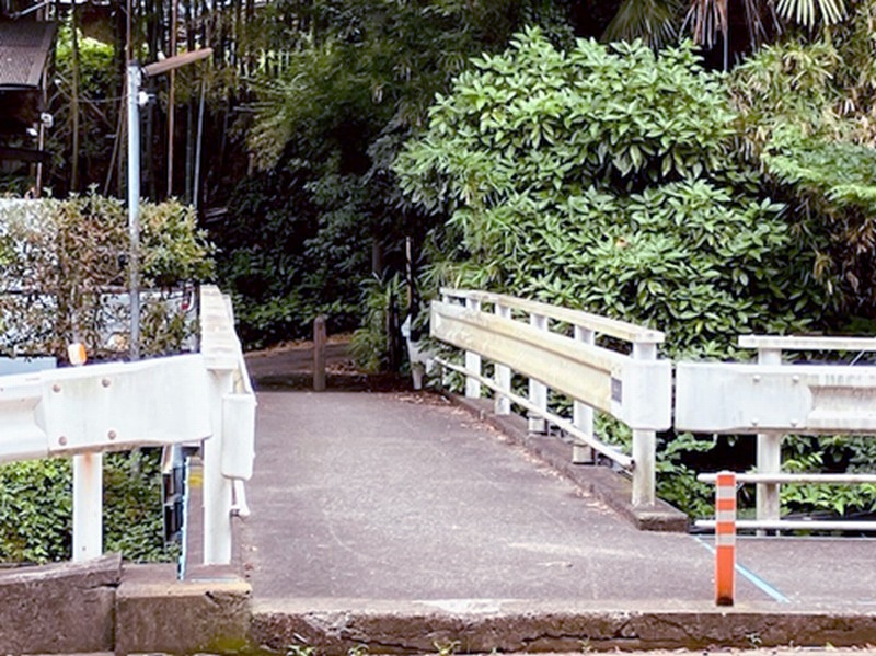 緑道「ささぶねのみち」を仲町台方面に歩いていくと、茅ケ崎公園にたどり着く。この公園には、池から流れ出る小川にかかる小さな石橋が存在する。