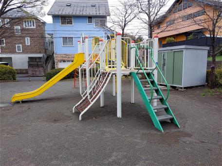 公園には、鉄棒、ブランコ、すべり台、ジャングルジム、石のオブジェなどひととおりの遊具がそろえられ配置されている。