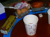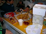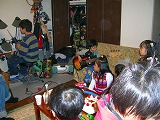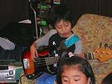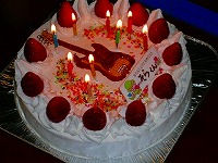 ☆握りすし:サーモン巻、たまご巻、かんぴょう巻、スパムむすび(スパムの缶ズメから出してスライスしたものを軽く焼いてのせるだけ)、いなりずし(天カス入り、つまり、たぬき“天カス”ときつね“いなり”)のプラレール回転寿司。☆チキンから揚げ ☆オニオンリング(輪切りにしたたまねぎを、てんぷら粉に卵を少し足して入れて揚げる) ☆ミニミニアメリカンドック(ウインナーにホットケーキの種を水で溶いて、つけて揚げる) ☆おそば(こだわり醤油で作った、自家製つゆがおいしいおそば) ☆お友達持参のアップルコンポート ☆エレキベースの書いてあるデコレーションケーキ(パリジェンヌのケーキ) |