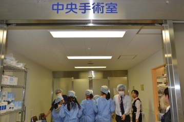次は管理課の沼尻事務部長(左)が、病院の概要を説明。「この病院は昭和50(1975)年に、地域の中心になる病院として開設しました。患者を診るだけでなく、学生も育てているんですよ。たくさんの診療科目のほかに、救命救急センター、集中治療センター、脳卒中ケアユニット、救急・集中治療室病棟もあります」 「1日平均1300人の外来患者があります。そのうち110人ぐらいが、初めてこの病院を受診する人です。ベッド数は567ですが、そのうち90%のベッドがいっぱいです。入院期間は、平均11日間。毎日20名ぐらいを手術していますが、今の手術は身体への負担が少ないので、入院期間が短いんです」