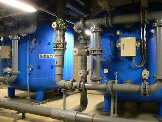 営業は早くても朝7時30分、遅い日でも夜11時だから、その間は休んでいても良さそうなものだが、常時気持ちよく使ってもらうためには、夜間の管理が大事なのだという。「もし夜間に機械を止めてしまったら、水が汚れてしまうんですよ」と設備担当の佐久間さんが、説明してくれた。 プールの管理はサブプールとメインプールに分かれている。水質検査は朝6時半頃、11時、15時、19時と頻繁に行っている。夏は汚れが激しいので回数を増やす場合もある。 冬期の今は、サブプール用の機械だけ稼動しているが、濾過器(左)、殺菌・脱臭の機械、オゾン発生装置、空気調和機、ボイラーなど巨大なタンクと太いパイプがいくつも並んでいた。 「万一、バイ菌でも発生したら大変なことになりますから、水質には非常に気を使っています」とのこと。私がこどもの頃、何10年も前の話だが、藻が浮いたようなプールで泳いでも病気になったとは聞いたことがない。今は、バイ菌に対する抵抗力が減っているのだろうか。