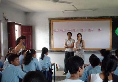 教壇の右側に立っているのが、アニタさん。ネパールの小学校の「環境教育プログラム」のなかで、ゴミ分別の大切さを指導している。 |