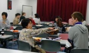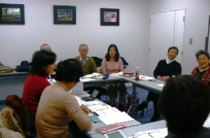 訪問した日は「Current カレント」というグループが、研修室1を使っていた。教育・経済・政治・国際・環境などホットな話題を英語で話し合っていた(左)。 「Current」は、ウェルカムキット作成や通訳をするなど、ボランティア活動もしている。 ちなみに、研修室1の壁を飾っている写真は、「つづき写遊会」の作品。3ヶ月に1度、交換している