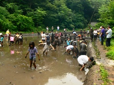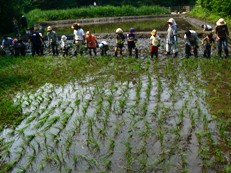 生態園を訪問するきっかけは、6月に田植えをするという話を聞いたからだ。それも機械ではなく、ほとんどの行程を手作業でやるという。昔ながらの田植えの様子を取材したいという思いが、訪問につながった。 2つある田のうち下の田は、近所の茅ヶ崎小と茅ヶ崎東小の5年生が、上の田は、毎年生態園が募集する親子たちが米作りを行っている。 6月13日の午前中に、茅ヶ崎小学校の生徒が「しろかき」をしていた。しろかきは、泥のかたまりをくだいて田全体をとろとろの泥にして苗を植えやすくする作業である。子ども達にとっては作業というより、泥んこ遊び。担任の先生方も全身泥だらけになって、「しろかき」ならぬ泥んこ遊びをして楽しそうだった。 1週間前にしろかきを終えた上の田の田植えは、13日の午後に行われた。応募した親子20組50人が参加。畑で20センチほどに育った苗束を持って、とろとろの田に足をとられながらも植えていた。 この苗は「まんげつもち」という品種の餅米。天皇陛下がお手植えする品種と同じだという。米作りを指導している金子さんは、「同じまんげつもちでも、ここで作ったのは飛び切り美味しいよ。農薬も使わないし、土がいいんだね」と嬉しそうだ。「今の子ども達は、お金さえあれば何でも手に入ると思っているが、米一粒を作るのにこんなに手がかかることを知って欲しい」とも話していた。