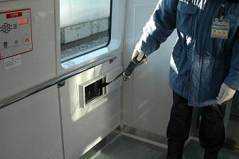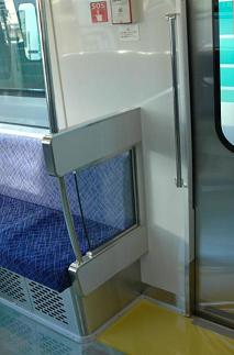車体は、神戸の川崎重工業で作られた。神戸から横浜の本牧まで船で、本牧からここまではトレーラーで運ばれてきた。 レポーターも真新しい車両(左)に乗せてもらった。ご覧のように、見るからに明るくて開放的で透明感がある。 連結部の扉や座席の仕切りは透明ガラスが使われ、圧迫感がない。 大きな窓は遮音の工夫がこらされ、紫外線除けのガラスを使っている。地上を走るのはわずか2.4キロメートルだが、紫外線の害から逃れられるのは有り難い。 乗客のことを考えた工夫が、随所に見られる。つり革の高さは2種類あり、背の低い人にも便利だ。プラットフォームと車両の段差は1.5センチ、隙間も6.5センチしかないので、車椅子でも難なく乗車できる。車椅子やベビーカーのスペースも作られ、ベルトで固定できる。車両のステップは、弱色者が判断しやすいように、黄色を使っている。 非常通報装置が、各車両に4ヵ所もついていることも安心感につながる。