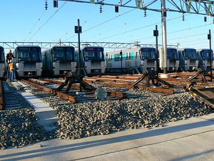 待ちに待った「4号線・グリーンラインの見学」を2/13の13:00〜16:45に。強風下で、どこからでも富士山スッキリ。工事事務所で、丁寧なパワーポイントでの説明を聞く。(そのデジタル・データーまで提供されるという親切さ!) 計画・経緯・現況などの詳細は他に譲るとして・・・・5人中では多分いちばん「鉄ちゃん」 的な見方としての、私が初めて知ったことを列記します。(川和の車両基地で見ました。) 1)リニアモーターとリアクションプレートの間隔が13mm。(写真が難しい!) 地上部分の降雪時対策は、どこでもやっている24時間運転と 通電による融雪で解決するとか。 2)2車両で1ユニットでの電気系統だが 各車両にリニアモーターが1つずつ。 現状では全部が川崎重工(神戸)製の車両。 3)架空線(非・第三レール方式)の低さにビックリ。背の高い者がジャンプしたら 届きそうだが、踏み切りなどのない地下鉄ゆえに杞憂です。 4)先頭車の運転席がなんと右側(ワンマン運転なので車掌の役目も。島式のホームゆえ 右が便利という理由で) 5)先頭車のおでこの両側にハロゲンかキセノン?のヘッドライト。可動式のホーム柵 のために上部になったとか。 6)先頭車の行き先表示には、まぼろしの「快速」の文字(左)も用意してあった!ちなみに、グリーンラインは「快速」はない。7)58パーミル(水平1000mで58m上る勾配)が2ヵ所あり、その内の1つは、川和町駅 近くの鶴見川の鉄橋! 道路からもよく見える。 22.6パーミルの山陽本線・瀬野〜八本松間を知っている方々は多いと思うが、 リニアでの限界は60パーミルということなので、それに近いスゴイ勾配。 どんなスピードになるか、どんな乗り心地なのか、たいへんな楽しみです。 8)連結部分に車両ごとに扉があった。(騒音対策のため) その扉が全面素通しで 先頭車から最後尾まで見通せたのにはビックリ。その上、広く見せるために、 床の模様は、錯視効果を狙った縞模様です。 9)レールは基地内40kg/m、走行車線部分は50kg/mでしたが、何mのロングレールに してあるかは尋ね忘れました・・・。よく知っている名古屋環状の名城線は、全部が地下ゆえに…継ぎ目なしの一筆書き…なんです。全長の13kmで何回のガタン・ゴトンが あるかが楽しみです 10)センター南・北間のブルーラインとの隔たりについて。まぼろしに終わるかもしれな いが、東京へ通じる5号線?の計画があってのことらしい。妙に納得しましたよ。(たーさん 記) 車両基地(左)で新しい電車を見せてもらった。ちょっとコンパクトでかわいらしい。工費を抑え快適な車両をめざした結果この形になったそうだ。 計画段階で中止になりそうなのをなんとかがんばって開通にこぎつけた話を聞くと愛着が湧いてくる。 このグリーンラインが出来ることにより交通の便がよくなり人の出入りが増え、さらに都筑区が多彩な地域になるのが楽しみだ。(えみたろう 記) ・鉄道を新たに敷設するのには大金が必要だが、今回はリニアモーター採用で車両の高さを下げられ、掘るトンネルの容積を少なく出来、かつ勾配をきつく(58m/1000mの勾配も上れる)できて、工事費の大幅削減で結局500億円もの節約ができたとのこと。一般人には計り知れない額だが、良かった良かった。 ・従来のブルーラインの収益は、ここへ来て経常利益が見込めるようになってきたが、グリーンラインの敷設でしばらく赤字が続くことになる。公共事業なので採算ばかりではなく、市民の利便性が重要である。みんなが利用し、かつ無駄を排し、健全経営を確保して市民の足として親しまれるようになってほしいものだ。 (ロビン 記) 事務所で話を聞いた後に、川和車輌基地で新型車両に乗って色々説明して戴いた。 |