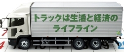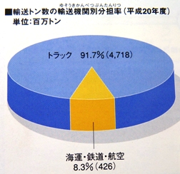 物流は包装・輸送・保管・荷役などすべてを含んだことばで、輸送だけではない。 物流の主流を占めるのがトラック。輸送トン数にすると、91.7%をトラックが担っている(左)。8.3%が海運・鉄道・航空である。船や飛行機や鉄道で運ばれた荷物も、最終目的地まではトラックを使って運んでいる。 こう考えると、もし日本にトラックがなくなったら、快適な生活が失われることは間違いない。トラック協会のポスター(左下)に「トラックは生活(くらし)と経済のライフライン」と印字されているが、まさにその通りだと思う。 今は、コンビニなどに代表されるように、Just in Timeが求められる。トラックは24時間動かざるを得ない。しかもトラック業者には、付加サービスが求められる時代になった。たとえば、荷物の積み卸しだけではなく、電気製品を例にとると、設置して可動するまでをドライバーが受け持つことが多い。 トラックが便利な輸送手段だということは分かったが、はたして環境にはどうなのだろう。大型トラックには、排ガスをまき散らして、空気を汚染しているようなイメージがある。しかし、トラックが使っているディーゼルの方が、乗用車が使っているガソリンよりも、二酸化炭素の排出量が少ないそうだ。しかも、トラック協会は、エコドライブの講習会を開いたり、駐停車のときにエンジンを止める運動を促進するなど、環境問題には真剣に取り組んでいる。 「国や自治体が排気ガス規制強化をしたときには、排ガス低減装置をつけたり、トラックを買い換えるなどで対応してきました。トラック協会も、補助金も出すなど協力しました。首都圏の空気はきれいになったと、石原都知事や自治体に感謝されています」と、高橋さんは少し嬉しそうに話した。 「環境に良いといわれる電気トラックが出てくる可能性はありますか」と聞いてみた。「いやあ、電気トラックが普及するのは、まだまだ先の話だと思います。でも、小型・中型トラックでは天然ガスを燃料にする車輌や、ハイブリッド車がすでに活躍していますよ」。
