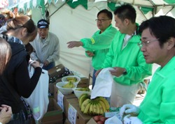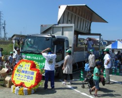 左写真は、果物や野菜の販売。安いのであっという間に売り切れてしまう。生鮮食品が手元に届くために、トラックはなくてはならないライフラインだとアピールする目的もあるという。 ほかにも「トラッくん風船」や「チョロQ」など子供グッズを販売していた。パンフレットなどを渡して緑ナンバートラックをさりげなくPR。グッズや野菜の収益は、地元の福祉団体に寄付している。 子ども達に実際にトラックの運転席に座ってもらい、ドライバーの視界がいかに限られているか、実感させる。 あらかじめ設置した自転車や人形がまったく見えないことにびっくりする子どもが多い。保護者までもが驚きの声をあげるそうだ。 トラックは、あまりにも私たちの生活に溶け込んでいるので、トラック輸送の役割を忘れかけていた。今回の訪問で、改めて物流でのトラックの重要性を認識した。(2010年12月訪問 HARUKO記)