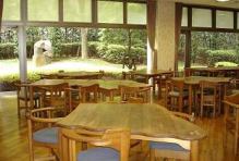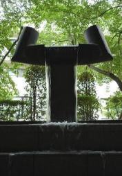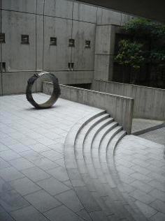 レポーター4名は、「ビルは知っているけれど、何をしている会社かよくわからないわね」と、心細さを抱えながらの訪問になってしまった。レポーターとしてはある意味で失格であり、図研さんに失礼だ。 この笑顔に甘えて、特に専門のCADについて、無知な質問を重ねたが、丁寧に答えてくださった。結局、昼食を挟んで3時間以上、お邪魔して楽しい時間を過ごした。 地上6階、地下2階のビルそのものが、「お宝」といえる。このオフィスの研究員・社員は約320名にすぎない。いかに、贅沢に作られているか、おわかりだろう。竣工は1990年だが、翌1991年に「日経ニューオフィス推進賞」、1992年に「横浜まちなみ景観賞」と、立て続けに大きな賞をもらった。受賞が納得できるビルだ。 ビルに隣接して、横浜市の緑道「ささぶねのみち」(右)がある。緑道の木々とビルとの一体感は、まちなみ景観賞に相応しいと思う。 テーブルもユニークだ。ひとつのテーブルは、ジグソーパズルの一片になっている。組み合わせて、大きなテーブルにすることもできる。私達は、この食堂で定食をご馳走になったが、天然木のぬくもりと四角四面でないテーブルを前にすると、柔軟なアイディアが生まれそうな気がした。残念ながら、一般には開放していない。 図研を初めて訪れた人は、美術館に紛れ込んでしまったかと錯覚するだろう。建物の内外に、7つもの彫刻が置いてあるからだ。すべて、彫刻家・関根伸夫氏の作品である。7つ全部を紹介するスペースがないので、3点を紹介するが、7つとも「お宝」だ。