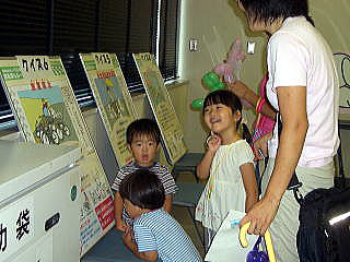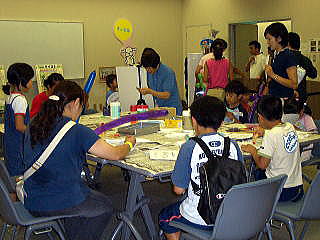 工作コーナーは 夜光反射材を使ってうちわを作ろう うちわを持って歩けば夜道も安全??? |