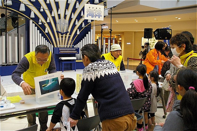 海洋実験教室(ペットボトル模型操作)や透明の板にセロハンテープを貼った偏光板万華鏡などめずらしい実験も行われていました。 |