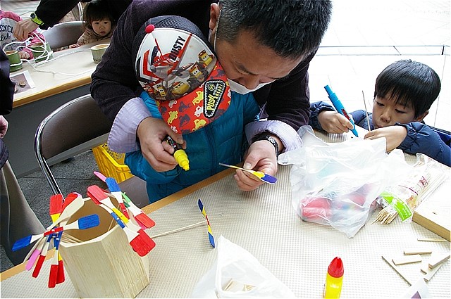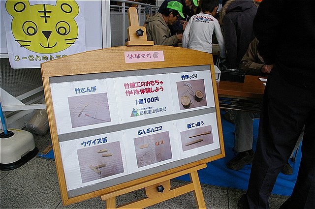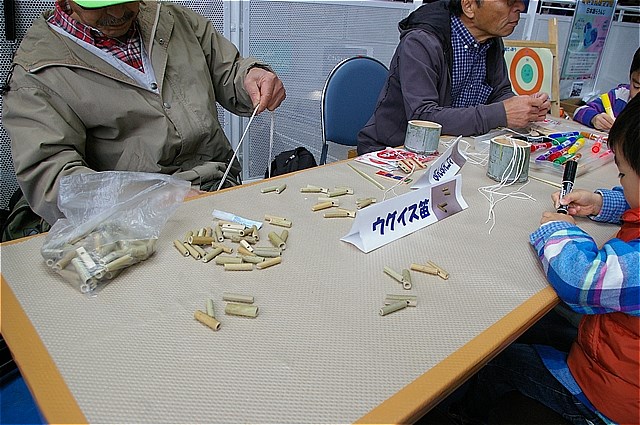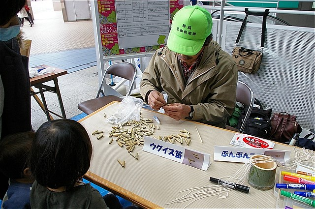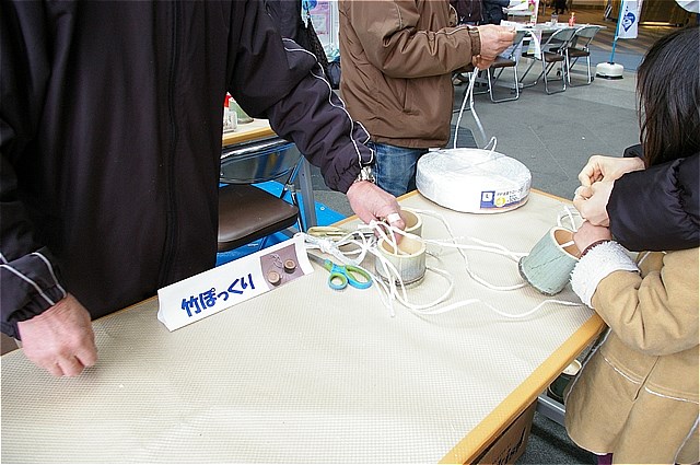 NPO法人 都筑里山倶楽部のメンバーの方々が「竹トンボ・竹ぽっくり・ぶんぶんコマ・竹てっぽう・ウグイス笛の作り方」の指導やポックリの乗り方、コマのまわし方、そして竹トンボの飛ばし方など、子供たちの手をとって丁寧に教えておられました。