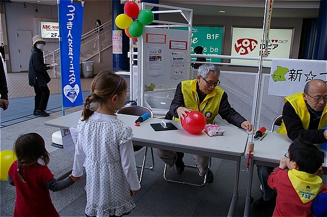 子供達は、指導員が針のようなパイクを膨らんだ風船に突き刺すのを間近で見ると怖いようでしたが、割れないで少しずつ空気が抜けていくの見て驚いていました。 |