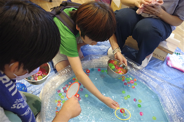 金魚すくいより易しいのか?男の子は次から次に器にすくい入れていた。そしてゲットしたボールの数を真剣に数え、友達に誇っていた。30個以上すくい上げていたようだった。すくえなかったお子さんには、別な景品を受け取って嬉しそう!だった。 |