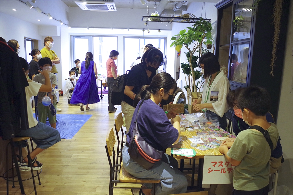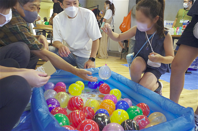 マスク&シールデコ、ヨーヨー釣りやカキ氷、くじ引きコーナー、スーパーボールすくいなど、次から次に展開されていた。 |