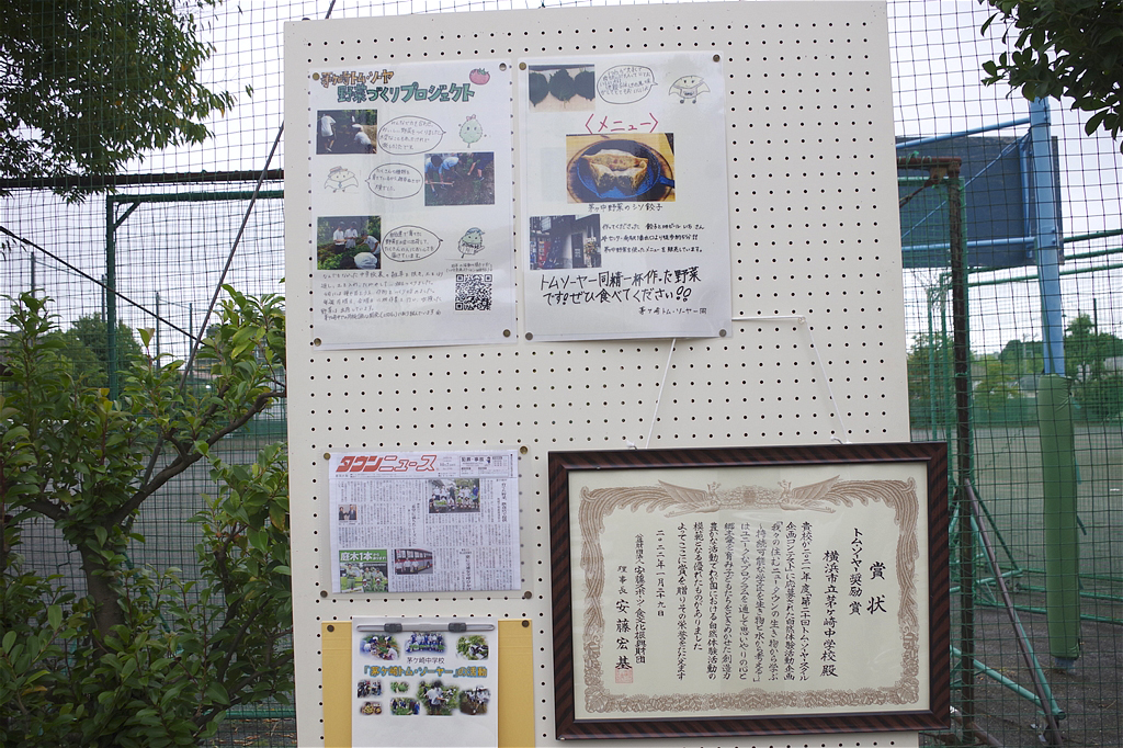 生徒の皆さんが取り組んでいる、「茅ケ崎トム・ソーヤー」の活動と校内で野菜作りを行っている事を知っていただくためのPR用パネルを展示していた |