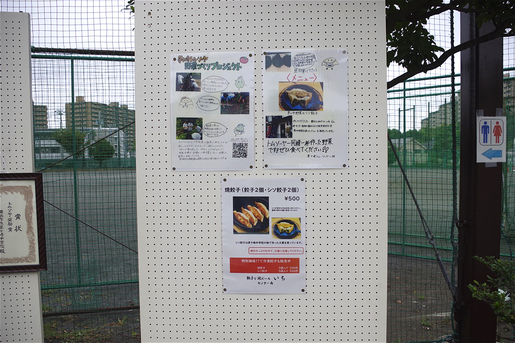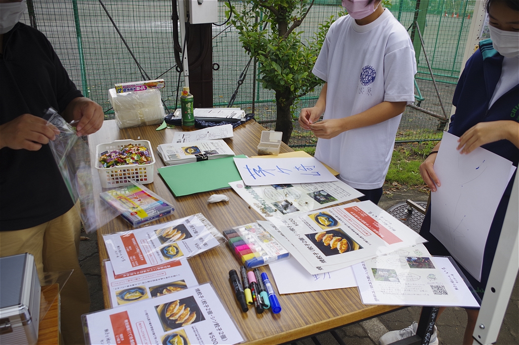 餃子のメニューチラシの制作、販売場所までの導線の矢印や商品パックのシール、さらに自分たちが取り組んでいる「茅ケ崎トム・ソーヤー」の活動を知っていただくためのPR用パネルを展示。