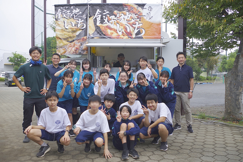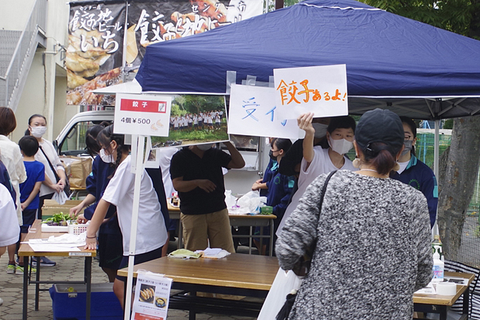 「餃子のキッチンカー」は、「茅ケ崎トム・ソーヤー」活動の一環で、校内で作った野菜を卸していたお店「餃子と地ビールの”いち”」と共同販売のキッチンカーである。2年目を迎え新たな取り組みとした餃子販売は、生産(野菜作り)→卸(地域のお店)にとどまらず、ユーザーの手に渡る販売まで携わることが出来れば、さらに生産意欲にもつながるとの思いから”ふれあい祭”に参加を試みたとのこと。 |