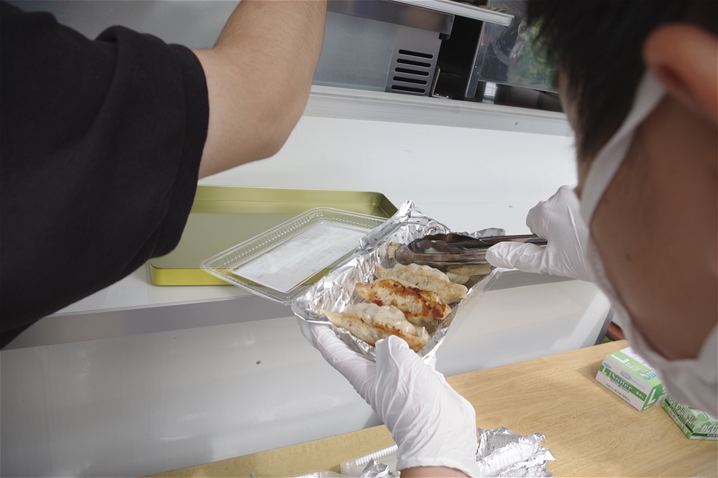 不慣れにもかかわらず、焼きあがった餃子のパック詰めを行っていた |